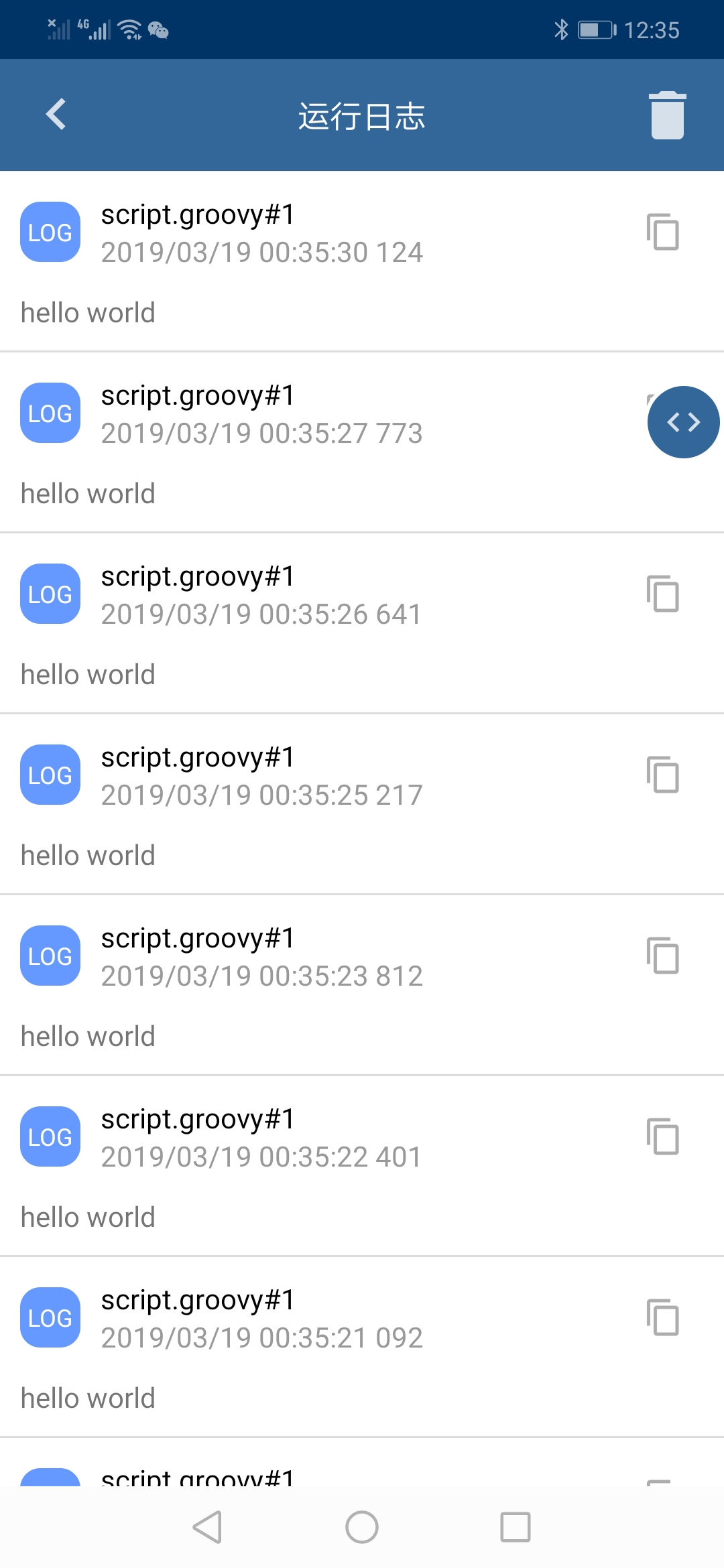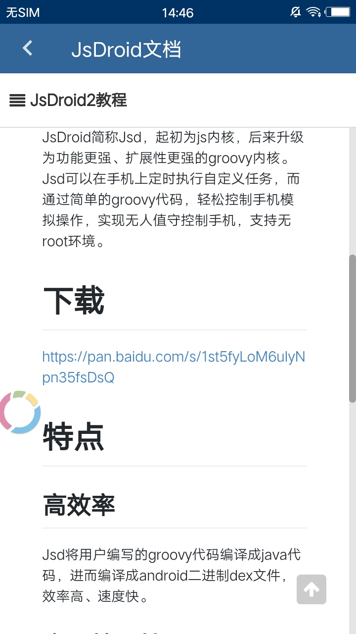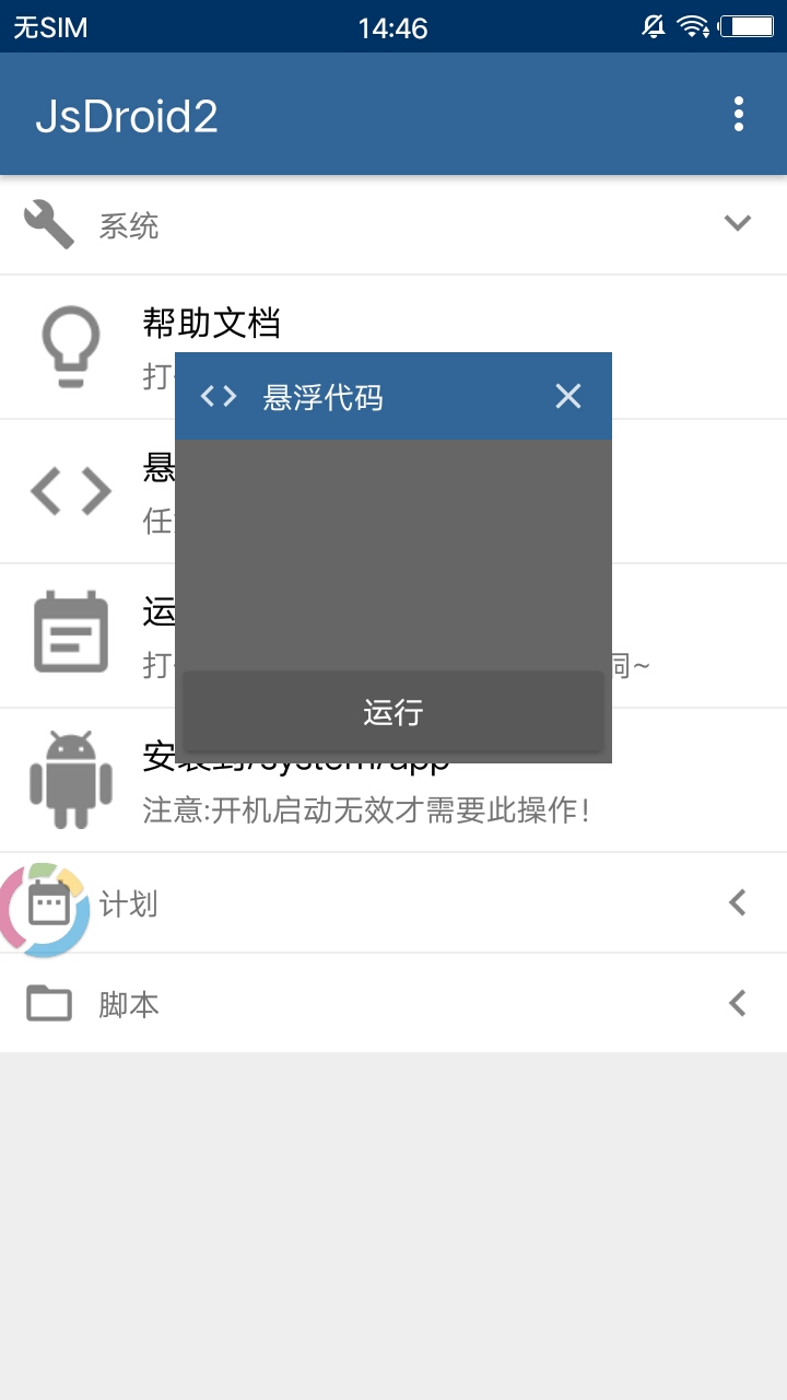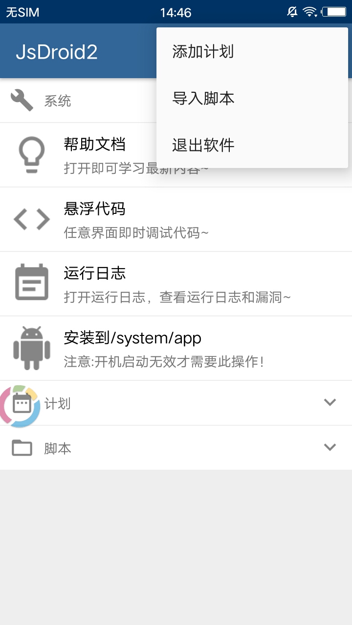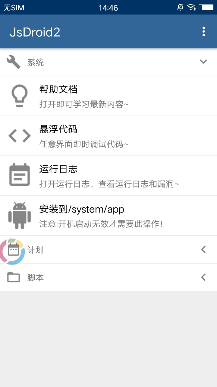JsDroid2是个很方便也很好用的手机版操作工具,通过groovy代码,去进行手机模拟器的操作控制,就算是没有人可以控制手机,不用ROOT权限,也不占用你的后台,断网也可操作,实用性还是不错的,支持一键导入本地的脚本以及添加新的计划,可以用视频的教学形式去进行最新内容的学习,支持在任意的界面进行代码调试。