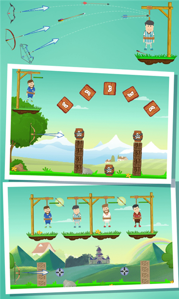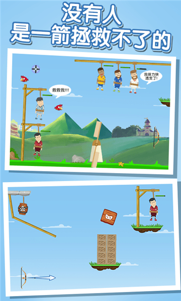 弓箭手拯救大作战手游采用清新卡通画风,游戏设定颇为新奇,有人被绳子吊住了,玩家需要射箭将绳子弄断,救下那些人。感兴趣的玩家千万不要错过,赶快下载试试吧!