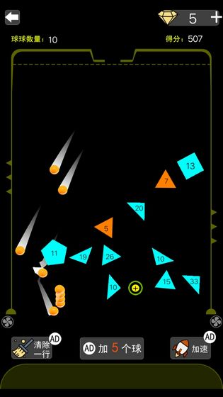碎块该怎么消除呢,当然是通过发射球球来进行消除,通过打击碎块来降低方块上面数字。《砖块爱消除手游》是一款益智消除类手机游戏,在游戏中,玩家需要发射弹珠去击打碎块,这个角度的选择尤为重要,所以,就需要大家拿出很多年不用的物理知识了,感兴趣的小伙伴赶紧来点击下载吧!