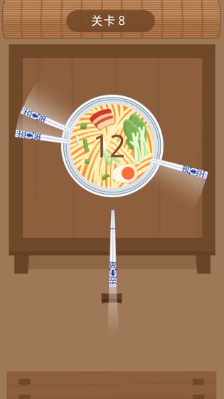 发射筷子来射中面条,避免跟其他筷子相碰撞,射够足够数量的筷子,你将赢得比赛,然后可以吃大碗宽面啦。注意大碗摆动的速度一直在变,要时刻小心,你准备好了,挑战大碗宽面了吗?