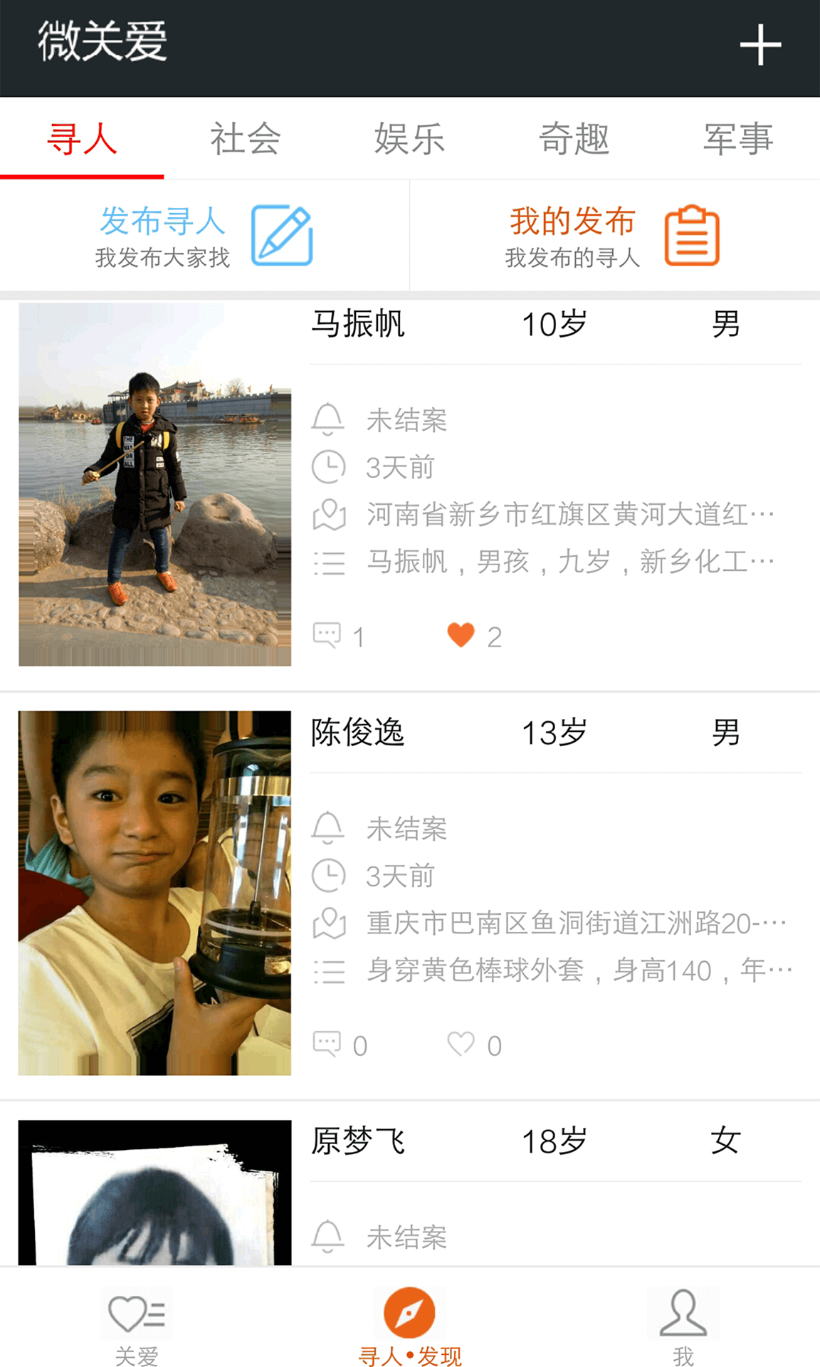 【发现 寻人】发布寻人信息同时可以分享到微信、QQ上,让上亿的热心网友和你一起寻人,为社会传递正能量。