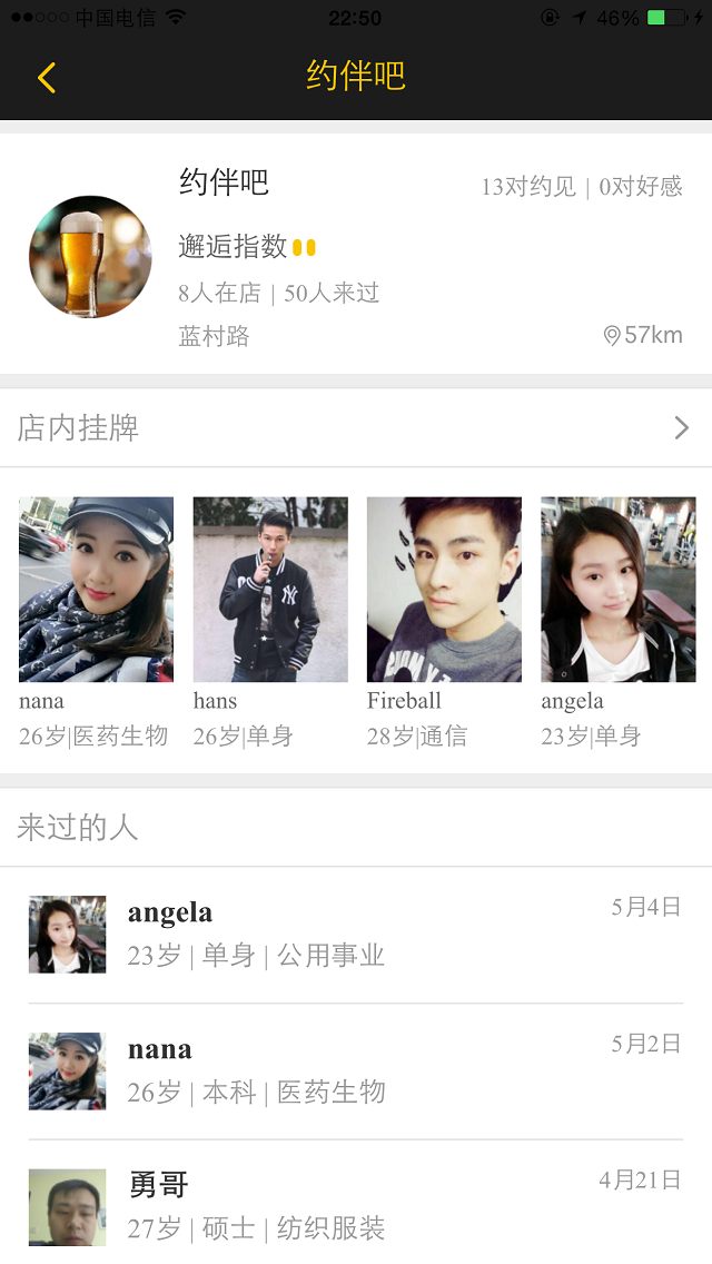 约伴:单身汪们可以在店约伴,桌游,咖啡,旅行,随意互动