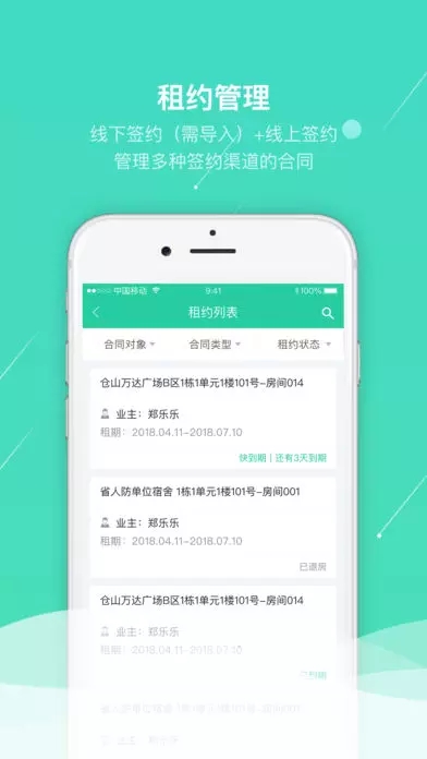 3、租约管理:线下签约(需导入)+线上签约,管理您多种签约渠道的合同;