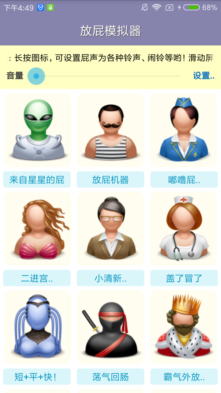 放屁模拟器,可以模拟各种情况下的屁声,非常的搞笑,并真心欢乐,来自星星的屁、嘟噜屁……在BUS或地铁上的拥挤情景下,放在兜里的APP突然放出各种屁声,大家会立刻腾出宽松的位置。