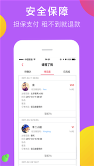 租人app是一款网上租聘人为你服务的应用软件,无聊的时候你可以通过租人软件租一个帅哥或者美女来陪你一起玩,你也可以把自己的空余时间租借出去,在租人app上分享自己的技能等待别人来租你,这里汇集了网上数百万的帅哥美女们,这里交友赚钱两不误,你还在等什么?快来租一个跟你一起聊天玩耍吧。