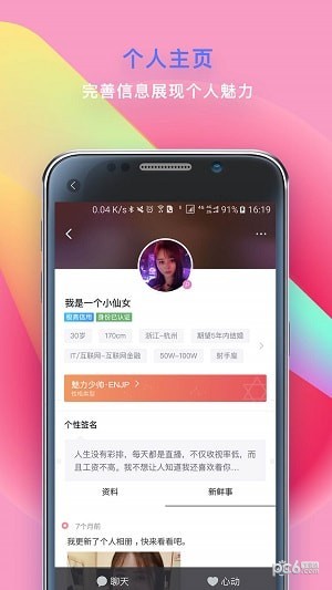 高清美图、全屏浏览,个人信息多方位展示,完成实名认证后遇到喜欢的异性直接聊天无限制。
