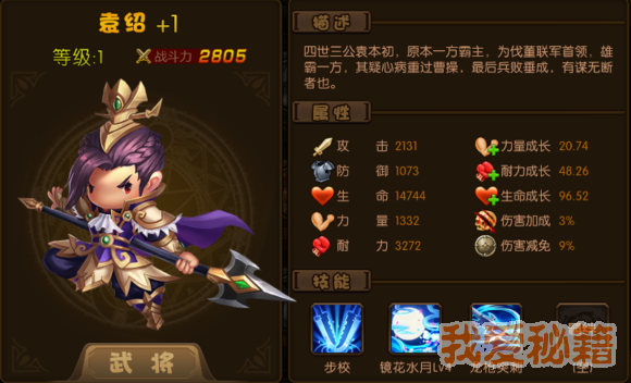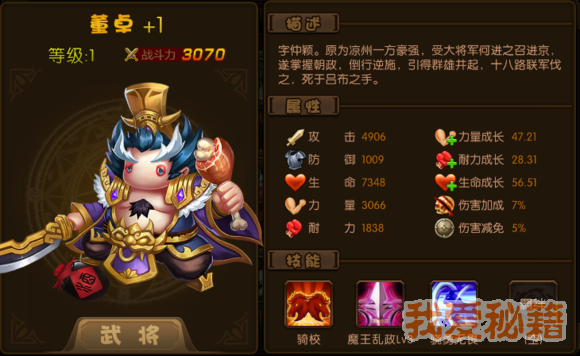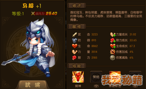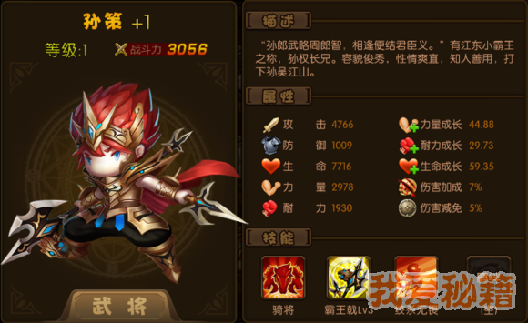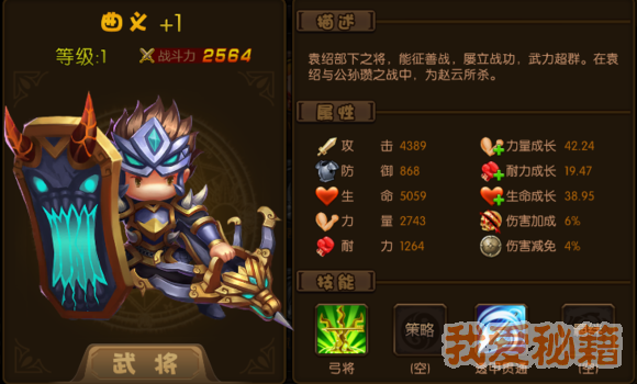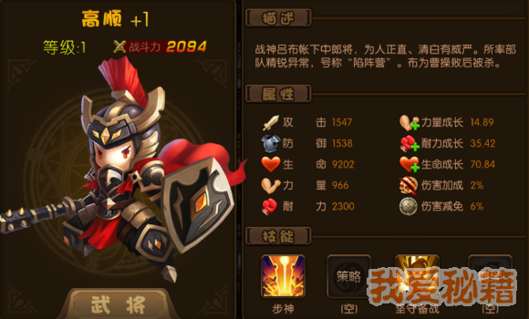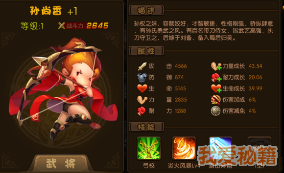 评价:前期武将战必备武将,需要强化加8才比较实用