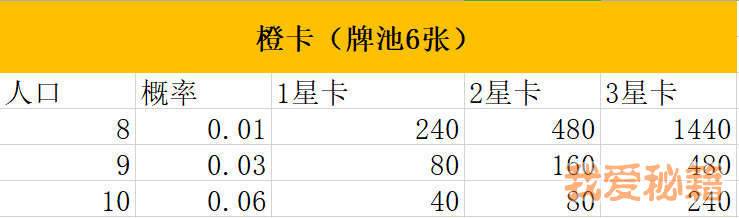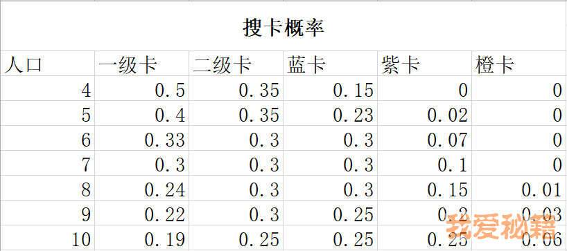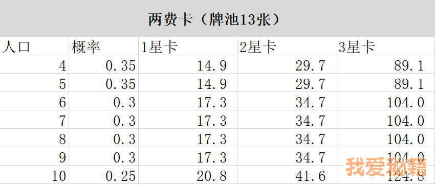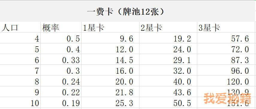 这一点假设要解释一下。有些朋友会提到说,如果想升3星卡,自己的仓库里必须屯有大量的该卡牌,会减小后面的牌来的概率。这是没错的,但与此同时,别的玩家会屯其他类型棋子的卡牌,会增加你抽相应牌的概率。这个情况在概率表现上是均衡的。热门棋子的搜卡难度会有提升,但目前仅考虑在平均点周围的结果。可以根据游戏环境适当调整结论数据。