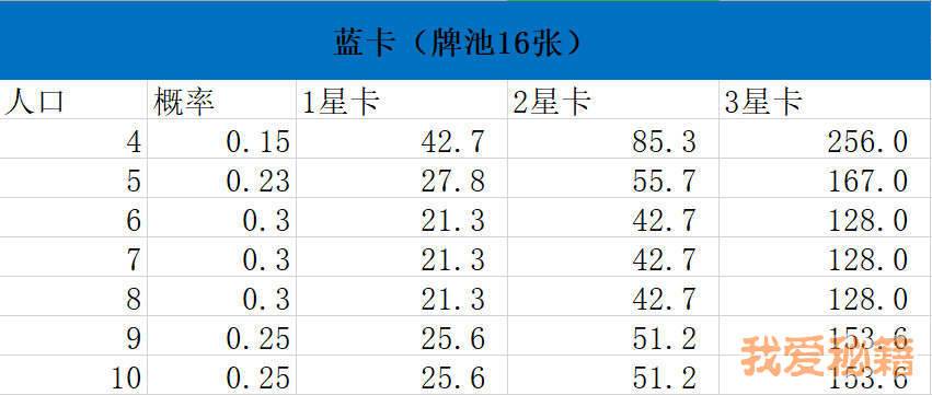 6人口是蓝卡达到最高抽卡效率的第一个时间点。从6人口以后,蓝卡的抽卡几率达到百分之30几率,即整场最高几率。如果套路中有很多蓝卡,你应该力求在6人口的时候将他们升到二星,第一时间增强战力。