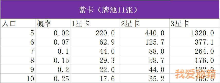 同时,值得一提的是,从9人口开始,三星紫卡的升级几率已经高于三星蓝卡了。实际上,从数据上可以看出,这个版本的蓝卡的搜索难度和升星难度都非常之大,这主要是由于蓝卡卡池过于巨大,另外搜卡概率曲线对于蓝卡实在是不友好。6~8人口时,二费卡升星的概率远远大于蓝卡。而到了9人口,紫卡升星的概率直接反超三级卡。也就是说,到了大后期,一个三星光法和三星船长的难度将小于三星影魔或三星电魂。最近玩的比较多的朋友可能也隐约会感觉到这一点。所以,非天命情况下我们尽量不要选择将三级卡升三星,这是性价比非常低的做法,有这个经济不如追梦一个三星紫卡。