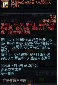 使用后,可以任意将8件高级装扮进行合成,合成过程中可以指定获得的天空的部位,魔枪士、女圣职者和枪剑士无法使用该梦想装扮合成器。(注:带有无法合成字样的高级装扮不能进行合成。)