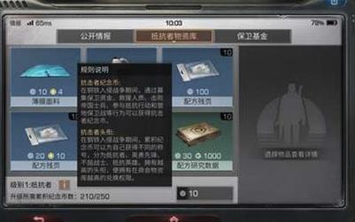 抗击币可以在"钢铁入侵"抵抗者物资库中领取配方残页,配方研究数据等奖励。