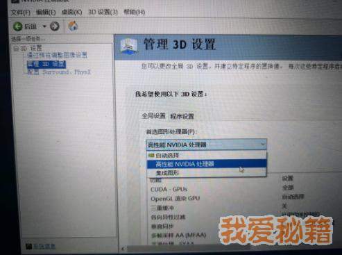 从左侧第二个选项"管理3D设置",找到如图的图形处理器,并选择"高性能NVIDIA处理器"。