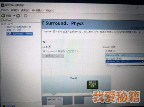 也是最最重要的一步:选择左侧第三个选项"配置surround PhysX",在右侧找到physx设置并选择性能最好的处理器(以个人为例,选择1050ti):