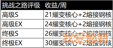 目前挑战之路是除兑换外比较稳定获取耀变核心 的途径,鉴于挑战之路改版后的难度5有相当的难度,本指南中将同时提供挑战之路难度5的高级区 以及终极区 的S级、EX级奖励 视为每周收益供参考并提供相应的兑换策略。