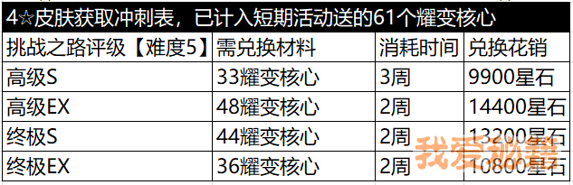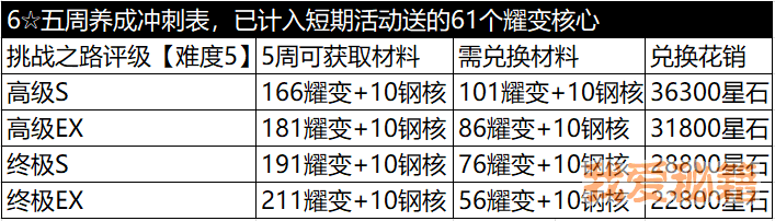 如不用星石兑换材料,处在挑战之路难度5的高级EX、终极S或终极EX挑战之路难度下4☆养成需要4周,处于高级S区则需要5周。