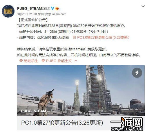 绝地求生将在北京时间3月28日(星期四) 08点30分开始正式服的停机维护,那么具体维护到什么时候呢,小编相信小伙伴们一定都想知道吧,下面小编给大家带来了一篇关于绝地求生3月27更新时间一览,希望大家喜欢。