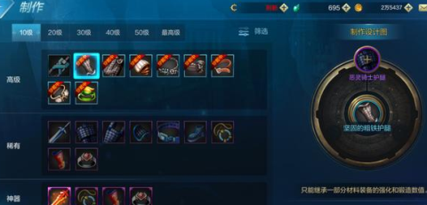 如下图所示,在完成了与诺顿交谈的任务之后,主界面的右下角便会多出一个"制作"图标,进入这一功能后就能看到分为三个品级的装备体系:高级、稀有、神器。这一制作系统的核心机制,是通过消耗一定的材料,从低品级装备向高品级装备升级。