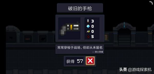 骑士的初始武器是一把白色品质的“破旧的手枪”,从“破旧”两字也能看出该武器比较废。从属性分析,破旧的手枪伤害只有3,射速一般般,暴击率更是只有零,该武器唯一让人欣慰的地方大概就是它的零蓝耗了。