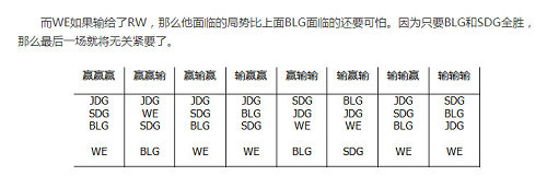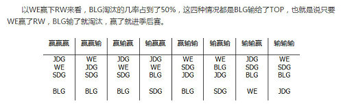 只要WE战队败于RW战队,那么他们淘汰的可能性就会有大概七成,小分落后比较严重的WE战队是很难承受得了失败的,如果面对RW的比赛输了,再输给京东是绝对会被淘汰的,而如果输给RW,即使赢了京东WE都有可能被淘汰(SDG和BLG最后全胜),要知道RW战队虽然已经确认晋级不了季后赛了,但放水还是不可能放的,最后一场比赛肯定是会尽力去打的,但是RW这个战队很吃状态,WE能否拿下完全要看当时的发挥情况。