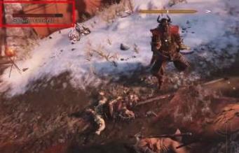 当玩家锁定敌人后,敌人的血槽和战姿槽都会出现在屏幕上,但是"中 BOSS"(Mid-boss)敌人的血槽永远显示在屏幕的左上方,和玩家此时锁定的敌人无关。这种设定能够帮助玩家在对阵中 BOSS 周围的小兵时,也能时刻注意中 BOSS 敌人的状态,从而不错失击溃他们的良机。下图中的主角暗杀的是一个普通的杂兵,但是此时屏幕左上方已经显示了远处发现玩家的武士将军的血槽。