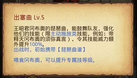 王昭君冈布奥是本套路的核心,技能升满之后可以强化主动施放类技能威力100%。同时出战自带琵琶曲谱,提高冈布奥主动技能能量积累速度20%,辅助类魔法效果加5%。