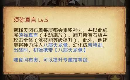 帝释天冈布奥拥有强力的主动释放技能“须弥真言”(50能量一次)。