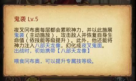 夜叉冈布奥主动技能“鬼袭”为一个大吸血技能。积攒30能量释放一次,满能量boss层可放三次,技能可回血,可以说是打boss必备利器。