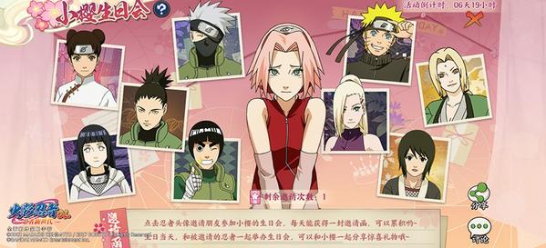 虽然小樱不是一个有故事的女同学,但是她一直在追随者鸣人与佐助,飞速成长着。,没有任何光环的她一直在努力修行,不甘心一直被同伴所保护。就在这样的过程中,她跟随五代目火影纲手学习医疗忍术和怪力。春野樱就是这样一个坚韧的女生,平凡而不碌碌平庸。在春野樱生日来临之际,游戏开启“小樱生日会”活动,每日登录游戏即可获得一封邀请函,每个邀请函可以邀请一位朋友。邀请函一共6封,可以累积储存,每成功邀请一位朋友消耗一个邀请函。每个邀请都会有简单趣味的小任务,如邀请春野樱的好友山中井野,玩家需要去木叶村西邀请井野,但是山中井野会“任性”耍一些小性子,玩家需要多邀请几次才会成功。