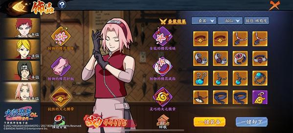 在饰品方面,由于春野樱【疾风传】是功能性辅助,推荐的饰品套装是“樱花套装”,可让其奥义技能“细患抽出术”冷却降低至1,并且治疗效果提升15%。如果是为了追求极致的加血效果。推荐6件都选择樱花套装,这样子治疗效果加成可以叠加。如果不想追求极致的治疗效果,也在4件套选择“樱花套装”,另外的2件套选择“火之套装”,由于春野樱【疾风传】普攻时体术攻击,所以需要选择“火之套装”能够提供体术150加成以及防御150加成。