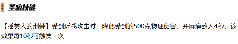 该圣痕的效果相当于生成一个500点血量的护盾(不防御远程伤害以及间接伤害),受到近战物理攻击时防御伤害并麻痹敌人。"每10秒触发一次"说的是护盾的CD而不是麻痹效果的CD,护盾耗尽之前可数次麻痹敌人 ,但是溢出伤害后仍会被打断。值得一提的是,该圣痕暂时没有对应特效以及冷却CD的图标,所以难以判断此刻护盾状态。