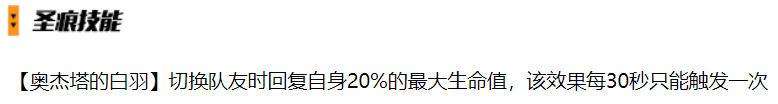 当自身离场时才进行判定,每30s的20%的生命值回复 ,在回复圣痕中算中上游,30秒的CD与慢切打法也比较契合, 在深渊/迪拉克之海中,有一定的表现空间。