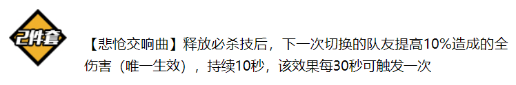 两件套: 释放大招后,切出的下一个人物增加全伤害, 可给辅助使用。