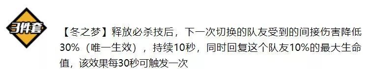技能解析: 与两件套非常相似,同样也是释放大招后切换人物获得的加成,不过三件套的技能偏向于苟活,可以让切换后的人物获得一定程度的抗流血和生命回复,延长主C在场输出的时间 ,本身确实是个非常不错的技能。