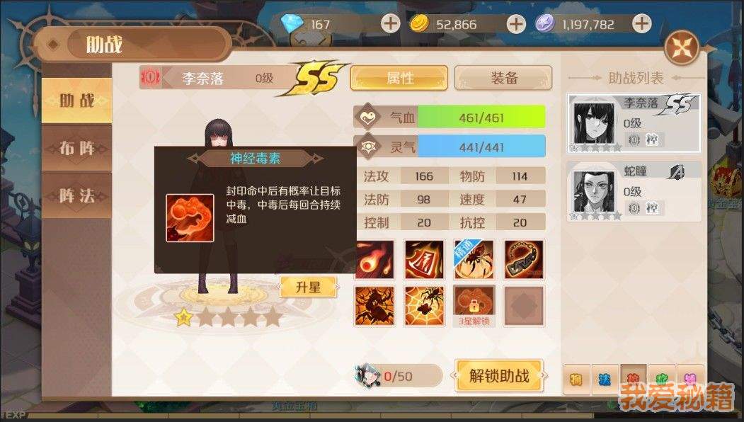 50碎片解锁,有蛇瞳在前,这个就不是刚需了。不是很建议解锁这个……如果你已经都解锁奈落了,那就升个3星吧,不然就很鸡肋了。