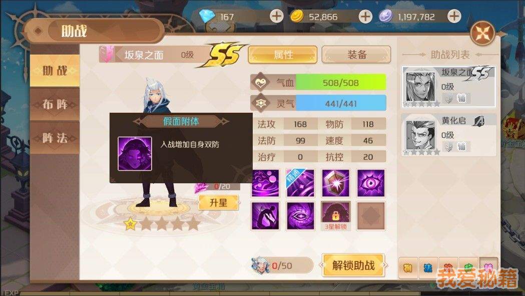 50碎片解锁,神级辅助,双防很高,往往一场战斗站到最后的就是他了。回血也高,有概率释放2次窃心取命。一般触发2次,基本全队的血也都回得差不多了。升3星,有材料升5星系列。
