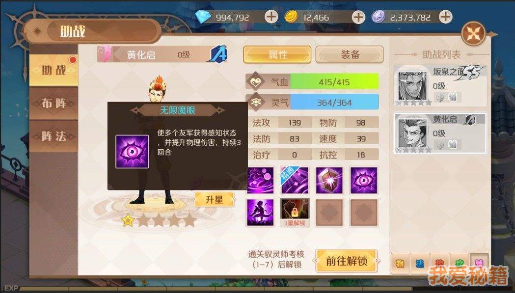 通关第六章解锁,非常优秀的单攻物理助战,可直接顶替前期的王司徒和宫城鸿。尤其是三星后解锁新技能。生效了的话,四舍五入就是一次斩灵决呀,而且下回合不用休息哟!而且本身追魂令自带标记能力,配合其他霸府的助战或者自己是霸府的话,使用轮转杀打标机对象会有高伤害加成。少一星是因为日常来说,有更好的免费物攻助战可以用。在没有其他助战好用的物理助战情况下,优先升星3星,装备和等级跟上。