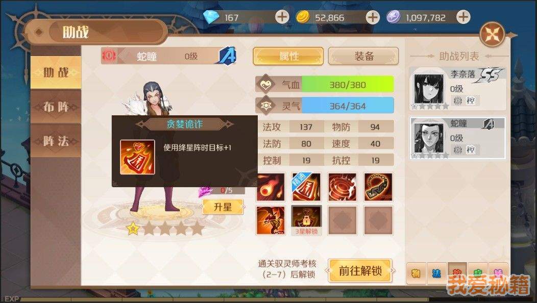 第二章通关解锁,如果不打算购买ss的李奈落的话,蛇瞳就是你唯一的控制助战了。而且他也确实好用。打难度副本,不光可以靠刷血,还能靠阵法封印。封印住对方后,对方无法使用技能。少一星是日常基本不用他,如果是日常向的话,实用性少点。大后期升星到5星后,跟其他玩家对战都非常方便。等级装备跟上,有石头优先升3星,5星后期有多的石头再升。