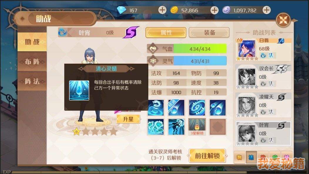 第三章通关解锁,对方有封印的情况,带叶宵绝佳!虽然也是拼概率,但是很多难度关卡就是靠他才能刷过去的呀。而且跟封印对战的时候,也不怕。少一星是因为叶宵精通的是水法弹,单打的。除开他的3星解锁的被动外,日常带他不太合适。升星推荐升到3星备用,要用的时候升一下等级和装备。