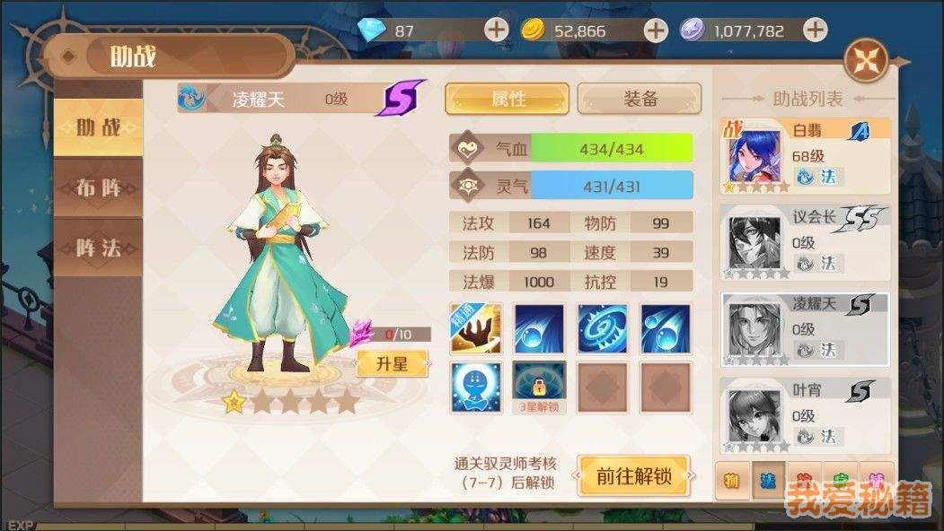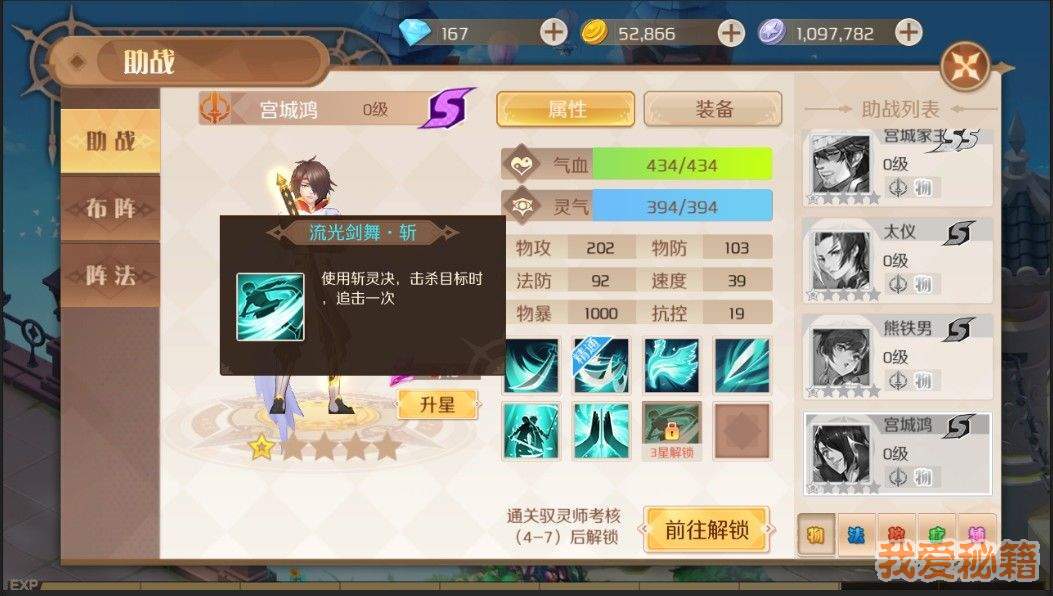 第四章通关解锁,精通斩灵决,总是优先打血最少的,感觉比较鸡肋。对方血很少的时候,放千军斩会更好,打的目标更多,下回合也不会再休息。对方血相对比较少,但是秒不掉的情况下,就只能打3下。追击又出不来,就很鸡肋。而且比较脆,只有在和宫城月一起出战的情况下,才会加双防。要用的时候再升等级和装备,不建议升星。