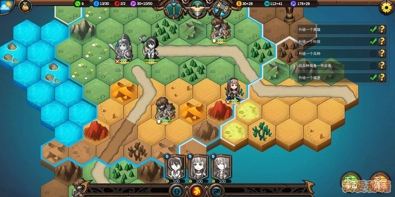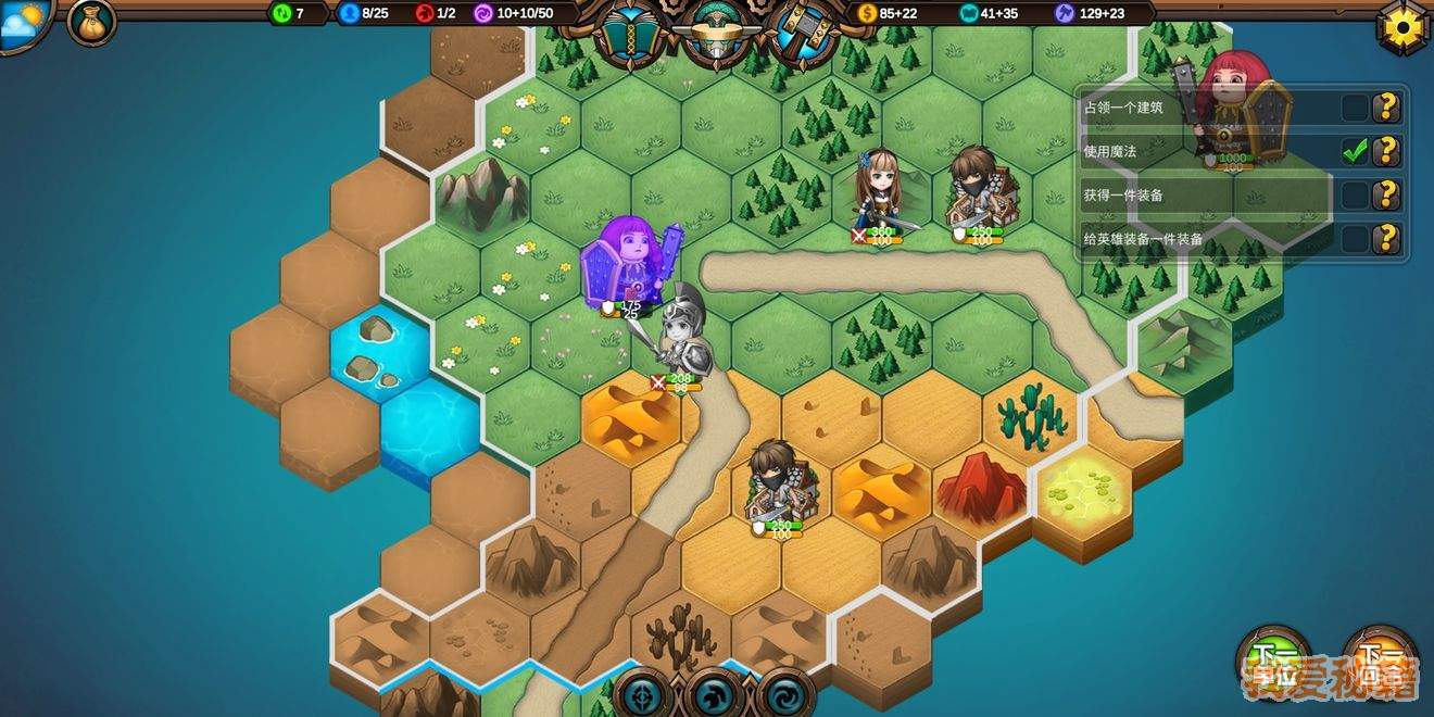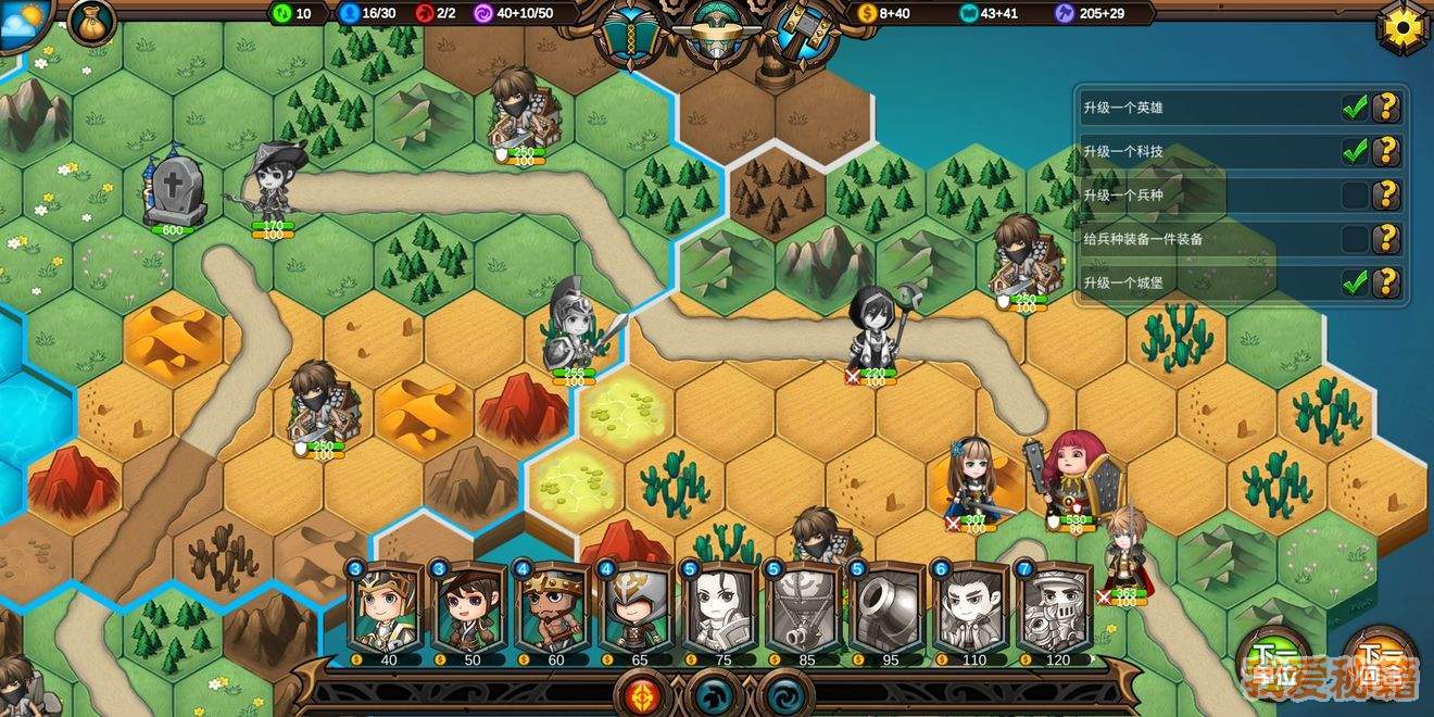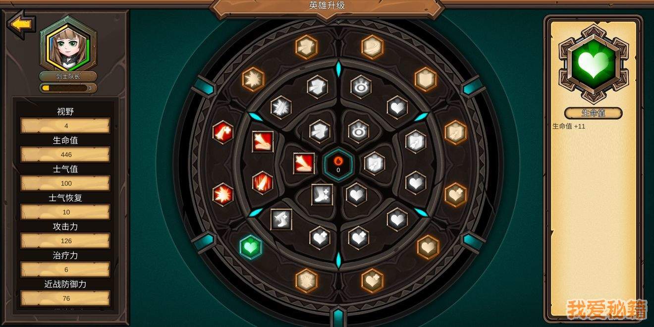 然后就是打打打,剑士队长升级了,点击右下角的箭头给英雄升级天赋,天赋还行,先升破甲这组天赋