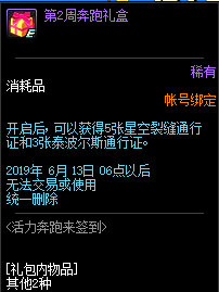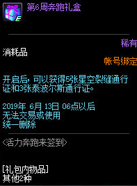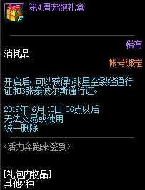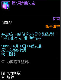 每周签到的奖励都一样,开启每周签到礼盒可获得5张星空裂缝通行证和3张泰波尔斯通行证。