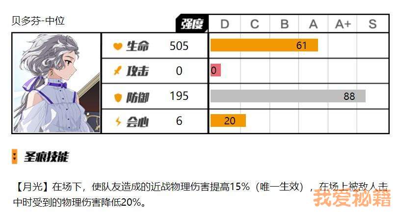入场时就能立即回复可观的SP,对于记忆战场中需要圣女第一时间开大 的套路来说非常强力,在其他场景中配合大招消耗SP不高的角色来说也有着非常亮眼的表现(具体看下文实战部分)。