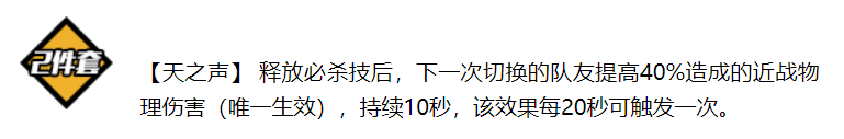 两件套: 施放大招后下一个切换的队友大幅增加近战物伤 ,效果拔群。
