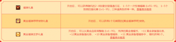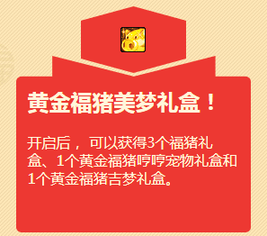 开启后, 可以获得3个福猪礼盒、1个黄金福猪哼哼宠物礼盒和1个黄金福猪吉梦礼盒。