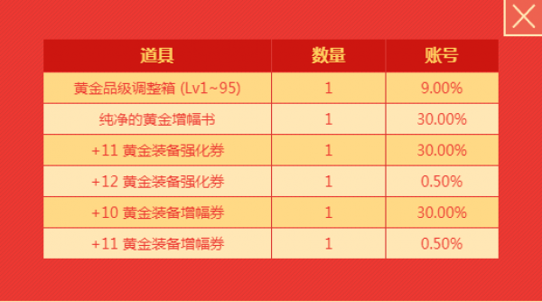 DNF黄金福猪吉梦礼盒概率公示和DNF黄金福猪吉梦礼盒概率如上所述,可见该礼盒中,强打书、+11黄金强化券、+10黄金增幅券都属于最低档奖励,每个奖励概率占比30%,而其中两张券子以跨五为例在拍卖行中目前售价为1500W和2000万金币。对于有需要的玩家们来说这个礼盒还是非常划算的。