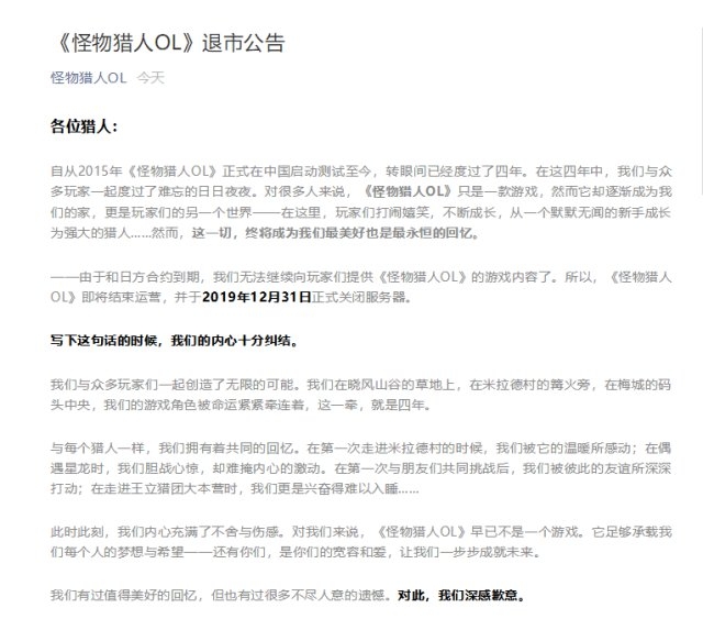由于和日方合约到期,我们无法继续向玩家们提供《怪物猎人OL》的游戏内容了。所以,《怪物猎人OL》即将结束运营,并于2019年12月31日正式关闭服务器。