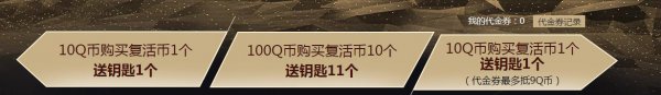 10Q币购买复活币1个可获得1个钥匙,100Q币购买复活币10个可获得11个钥匙;拥有代金券的玩家,可以使用代金券抵扣购买复活币并赠送钥匙,一次最多抵扣9个代金券,一旦代金券使用后无法退还(下单后未支付,订单被系统取消之后或手动取消之后会返还抵扣的代金券)