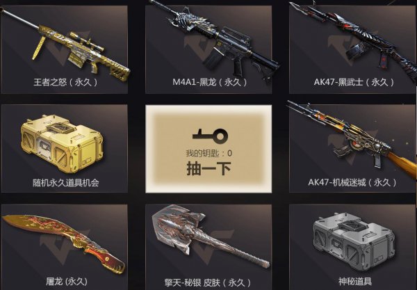 如果过玩家在奖池中抽中"随机永久道具机会",则下一次抽奖一定会抽中永久的王者之怒、M4A1-黑龙、AK47-黑武士、AK47-机械迷城、屠龙、擎天-秘银皮肤其中之一