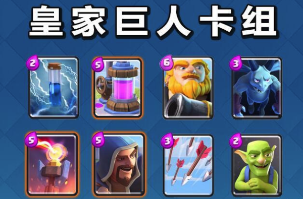 这次小编推荐的【皇家巨人推进流】卡组,除了必带的皇家巨人外,还有箭雨和小电,以及用来配合推进的法师,其余的卡牌包括哥布林、亡灵,建筑方面除了一波流必带的采集器,还有对付巨人很好用的BUG塔。